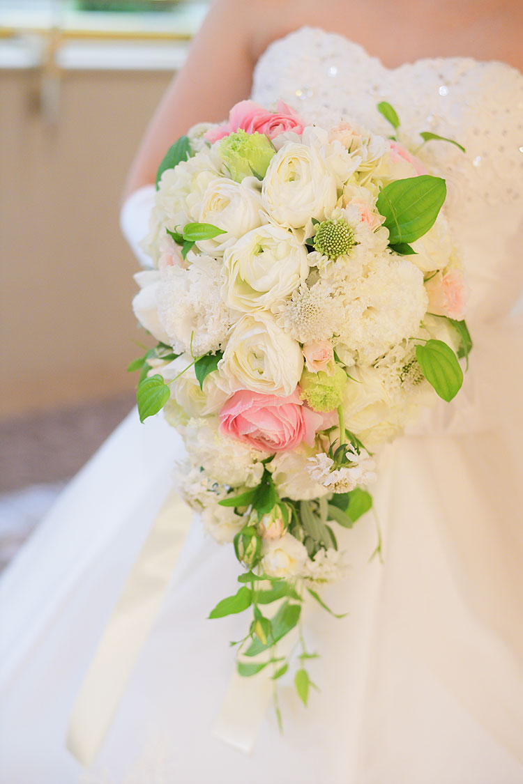 お母様からのベールダウンは今までの思いが溢れた瞬間。チャペルに差し込む柔らかな光の中、挙式をおこないました。フラワーシャワーはゲストの皆様と笑顔溢れる幸せな時間となりました。