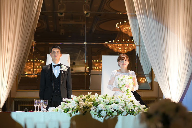 キャンドルサービスを行いながらのお色直し入場では、各テーブルに灯されたキャンドルの炎が、普段のおふたりの優しい雰囲気を表現しているかのような空間となり、披露宴会場があたたかな雰囲気に包まれました。ゲストの皆様にもゆったりとお過ごしいただける一日となりました。