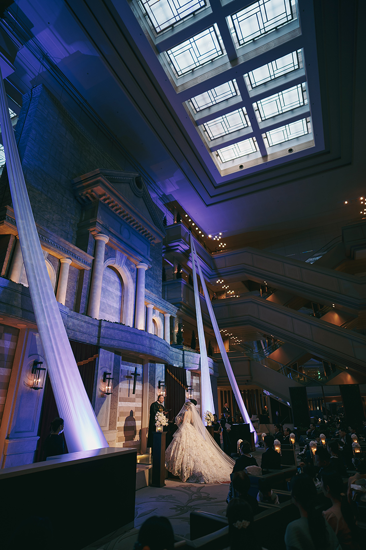 壮大なアトリウムラウンジ挙式に照明演出をプラス。シーンごとに変わる背景で、圧巻の挙式がよりドラマチックな瞬間となりました。