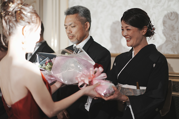 ホテルウエディングの優雅さの中にも、お二人らしいアットホームな雰囲気づくりを心掛けました。新郎のご両親も東急ホテルで結婚式をしており、家族で思い出の場所が増えました。新婦のティアラとベールはお母様から譲り受けた大切なアイテム。ブーケも新郎お母様の手作りで家族の愛を感じる結婚式となりました。